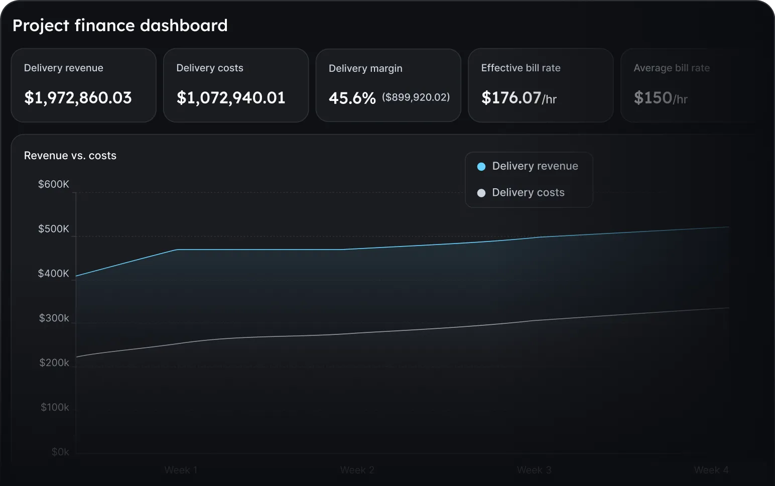 Whenever timelines shift or staffing changes, your projected revenue, delivery costs, and margin update with them. The data reaching Finance reflects what’s currently happening, not what was planned weeks before.